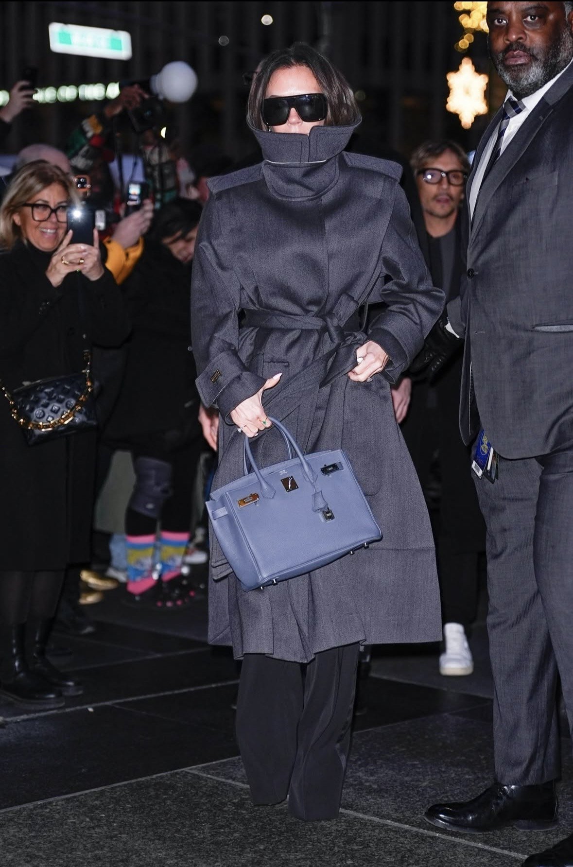 Beckham styled the look with black wide-leg trousers, keeping the palette streamlined and polished. The simplicity of the trousers allows the coat to remain the focal point, reinforcing her long-standing commitment to minimalism and precision tailoring. She finished the outfit with a blue Hermès Birkin 30, introducing a subtle pop of color that felt deliberate rather than decorative. It’s a reminder that contrast, when used sparingly, can be far more impactful than embellishment.