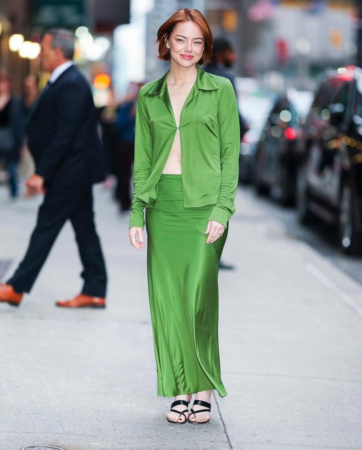Emma Stone stepped out in a vintage green silk blouse and matching midi skirt from Donna Karan’s Spring 1996 collection. Proof that archival fashion, when worn with ease, always feels current.