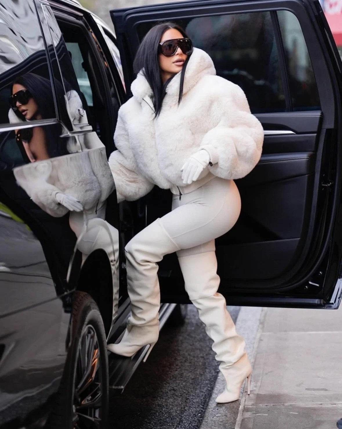 Her outfit centered around a cropped North Face jacket with a plush faux-fur hood, instantly giving the silhouette a soft, cloud-like volume. Paired with SKIMS’ form-fitting leggings, the look highlighted Kim’s sculpted, iconic curves while keeping the palette clean and tonal, a winter aesthetic she’s mastered over the years. She completed the ensemble with pointed-toe high boots and sleek white gloves, transforming a simple winter outing into a polished editorial moment.