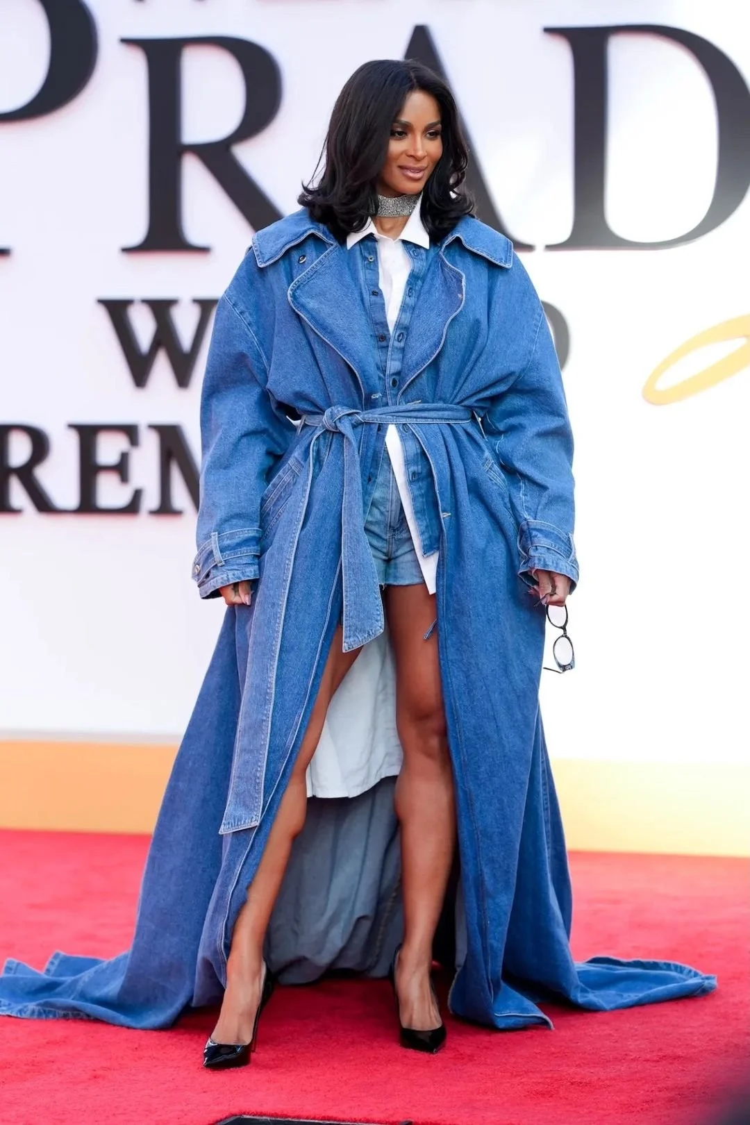 A dramatically oversized denim trench cinched at the waist floated behind her like a train, revealing a layered denim-on-denim moment underneath. Denim isn’t just casual wear anymore. In the right hands, it becomes a statement. And Ciara knew how to do just that. Managing to be one of the most memorable looks of the night, she finished the look with black Christian Louboutin Miss Z pumps, grounding the ensemble with a classic, pointed-toe silhouette that added just the right amount of polish, while her sleek sunglasses and choker detail sealed the cool deal.