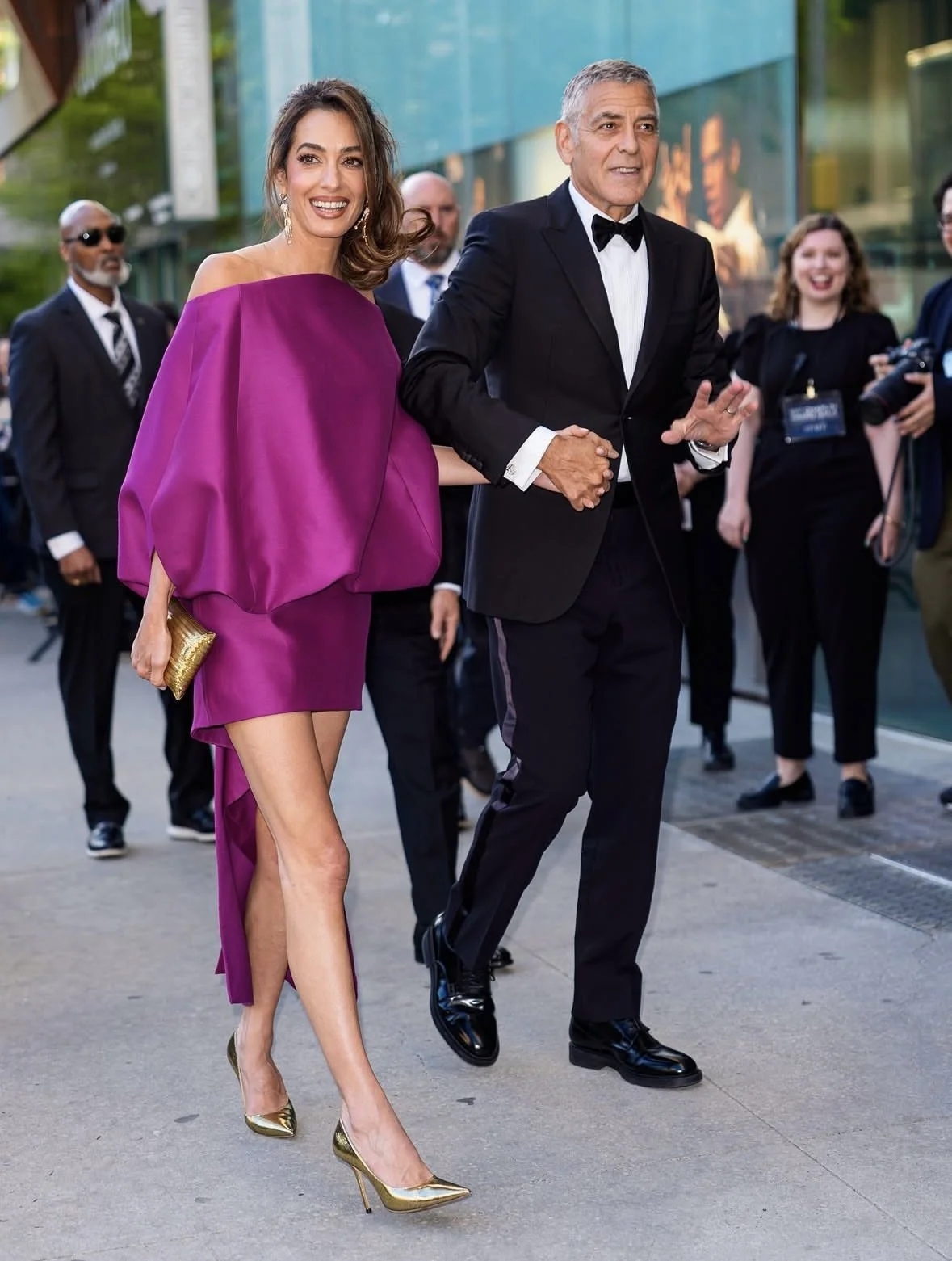 Her styling remained consistent with her signature clean and intentional approach. Gold pointed-toe heels and a matching clutch complemented the warmth of the dress, while her Panthère de Cartier earrings added a subtle layer of detail. Alongside George Clooney’s classic tuxedo, the pairing felt balanced. It’s a reminder of what makes Amal Clooney’s style so consistent. Each element feels considered, and the end result reads as polished, current, and entirely her own.