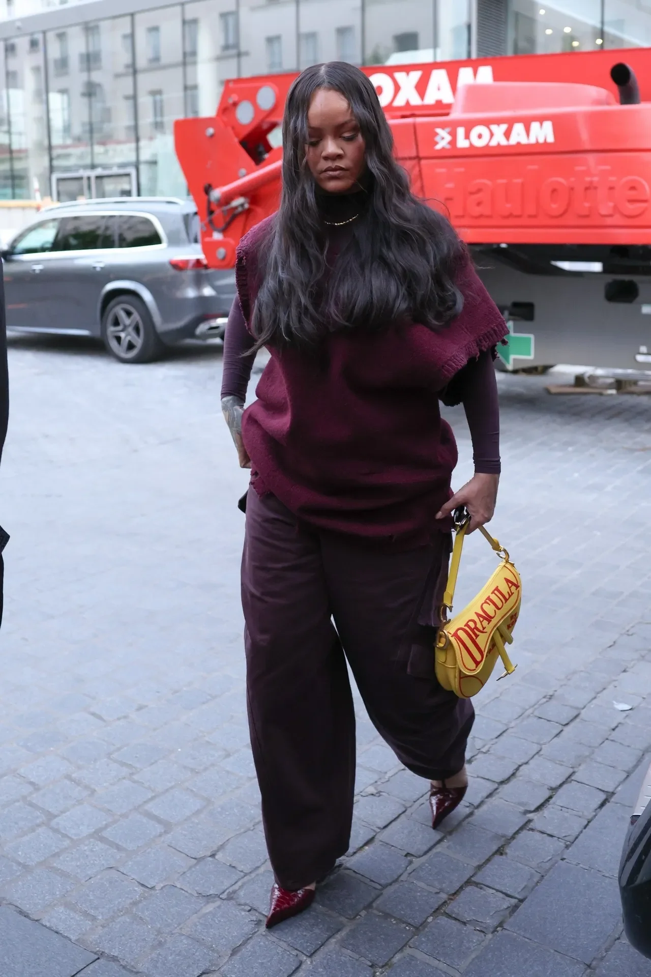 One thing Rihanna understands deeply is that a good outfit is all about balance. Pairing the bag that was inspired by the 1897 first edition of Dracula with an oversized long-sleeve oxblood sweater vest from Margiela that nailed the whole intentionally undone vibe, and grape-hued Alaïa cargo pants. Anchoring the palette with pointed crocodile-print heels in a coordinating deep red, keeping everything within that sultry, wine-stained color story.
