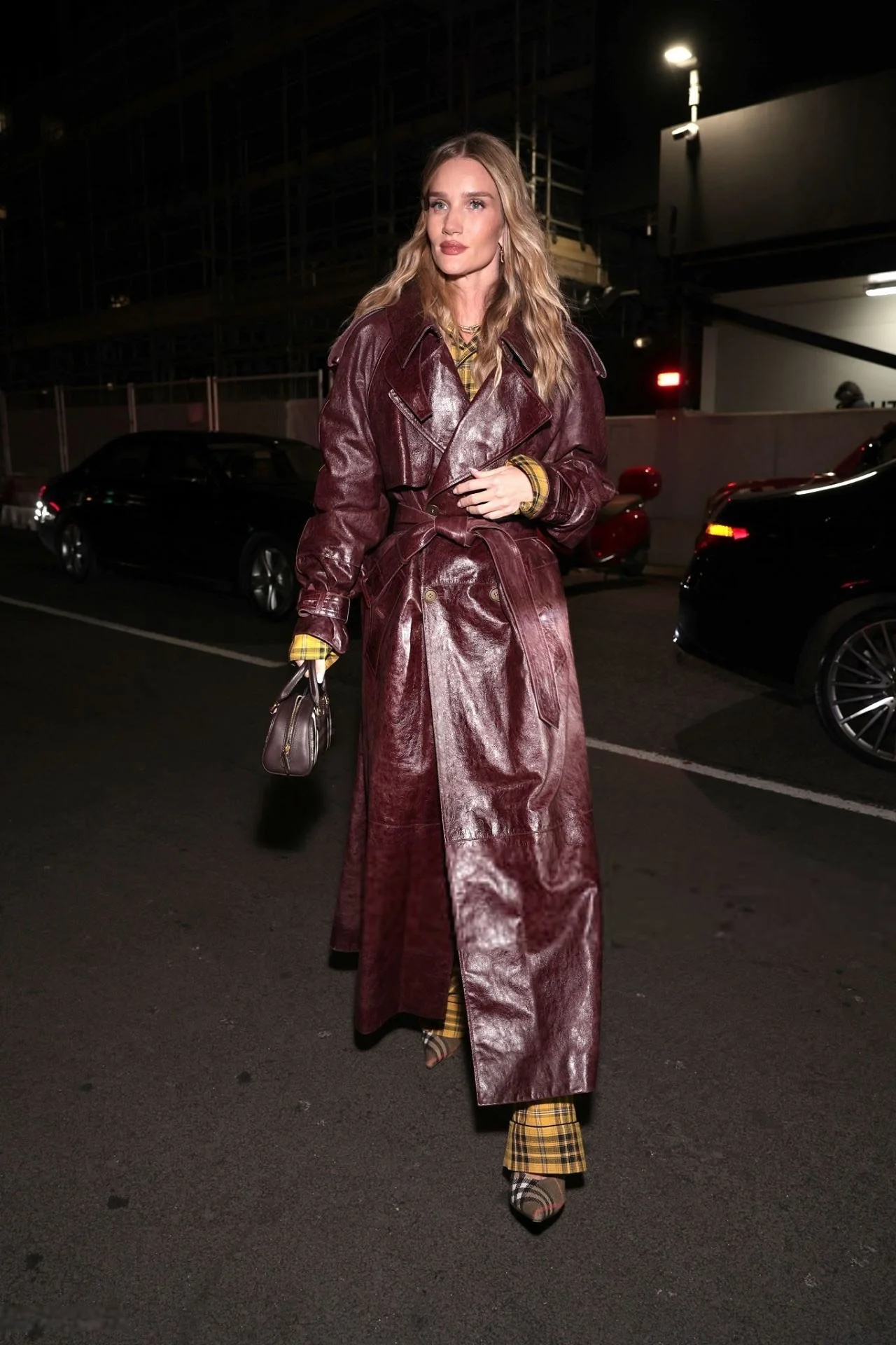 Styled in rich seasonal tones and modern British heritage elements, Rosie stepped out in an oxblood high-shine leather trench, a standout piece from Burberry’s Fall 2025 collection. The coat’s structured silhouette and glossy finish created a dramatic and impossibly polished impression. Peeking beneath the coat was a vibrant pop of golden tartan, adding warmth, color, and a quintessentially British twist. The unexpected pairing of deep burgundy leather over yellow plaid delivered a fresh take on heritage dressing, perfectly in sync with Burberry’s current creative direction.