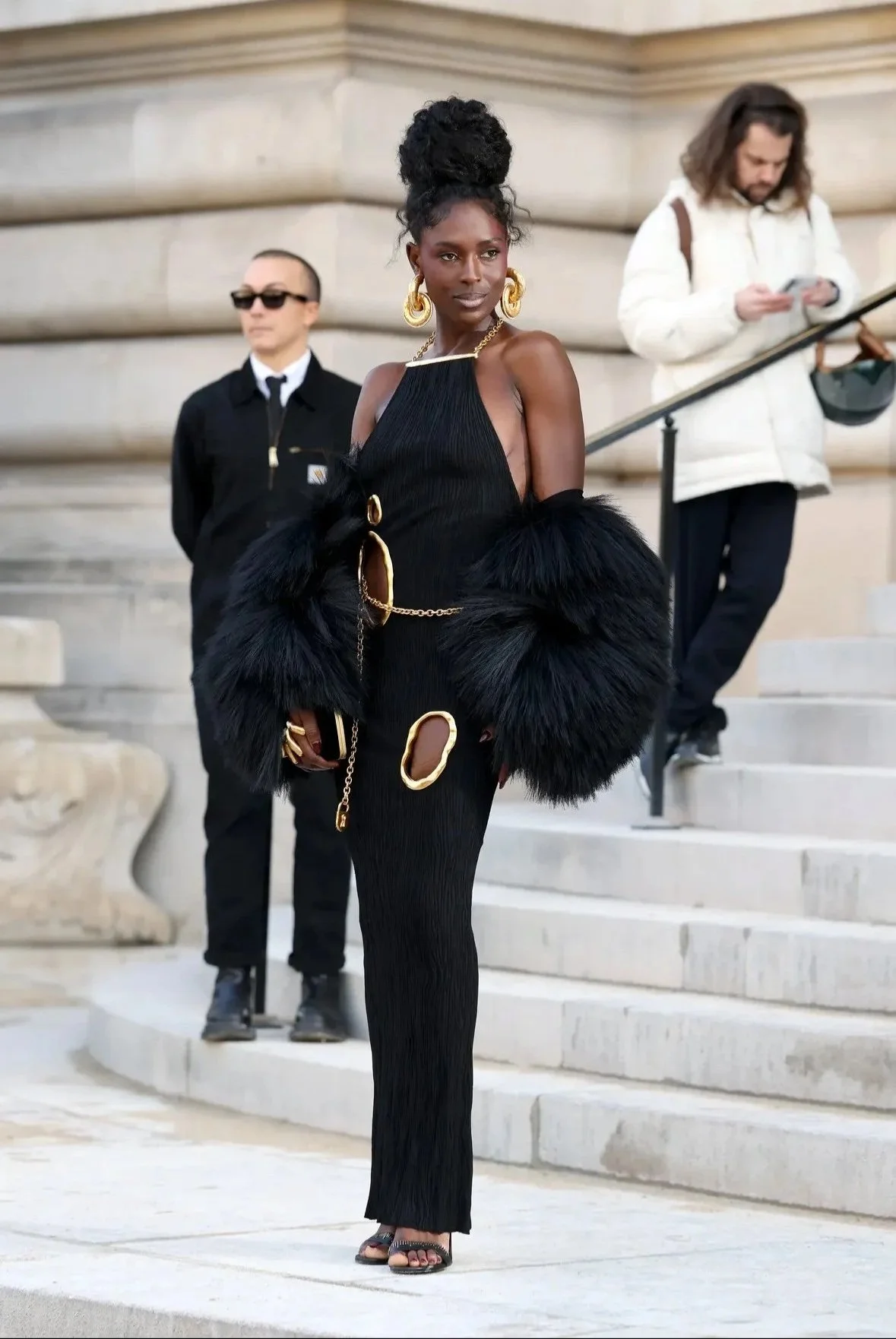 The most dramatic element of the look was voluminous black faux-fur sleeves. Plush and theatrical, they added a sense of old-Hollywood glamour while grounding the look firmly in couture fantasy. The contrast between the sharp metallic details and the fur's softness created tension, a hallmark of the Schiaparelli aesthetic.
