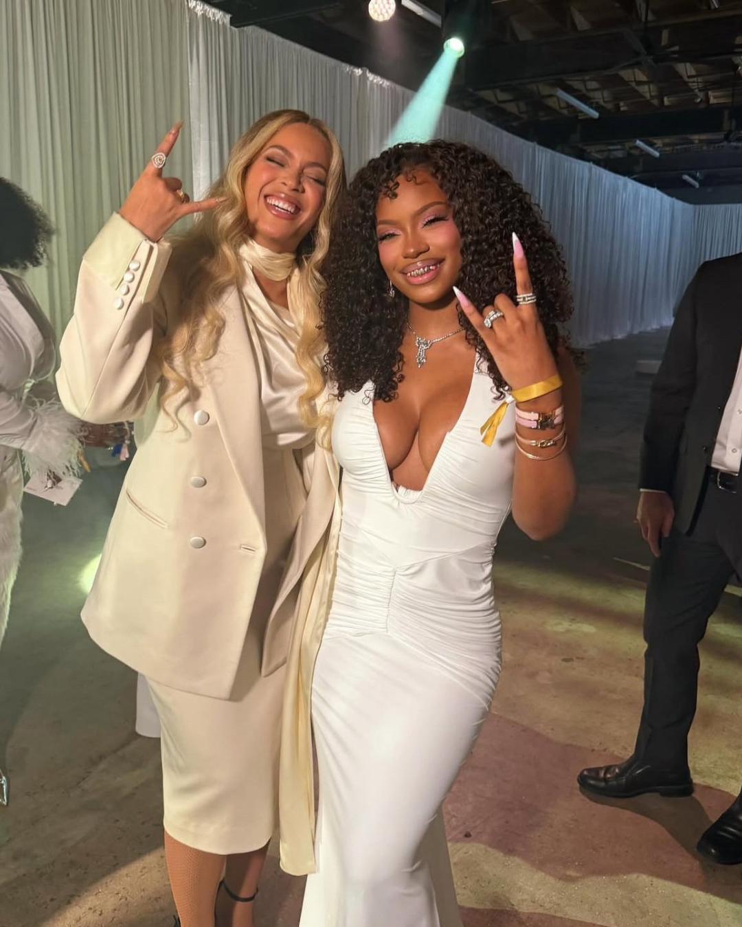 Dressed in an elegant white gown, Monaleo stood alongside Beyoncé, who kept things effortlessly chic in a structured neutral-toned look. The two posed together, smiling and clearly enjoying the moment.